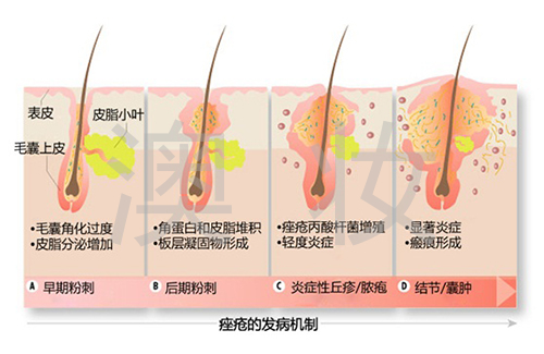粉刺分为开口粉刺和闭口粉刺,开口粉刺就是黑头和白头,闭口粉刺就是一个个小突起,皮脂腺不断分泌,累积在毛囊口,最后发展成脓包。