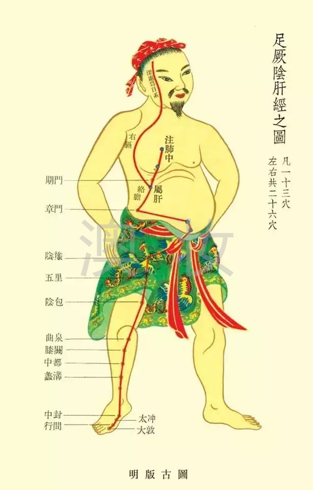 人体十二经脉之一。简称肝经。足厥阴肝经,流注时辰为清晨一至三点,即丑时。 足厥阴肝经与足少阳胆经相表里。循行路线起于足大趾爪甲后丛毛处,沿足背向上至内踝前一寸处(中封穴),向上沿胫骨内缘,在内踝上8寸处交出足太阴脾经之后,上行过膝内侧,沿大腿内侧中线进入阴毛中,绕阴器,至小腹,挟胃两旁,属肝,足厥阴肝经循行线路图络胆,向上穿过膈肌,分布于胁肋部,沿喉咙的后边,向上进入鼻咽部,上行连接目系出于额,上行与督脉会于头顶部。本经脉一分支从目系分出,下行于颊里,环绕在口唇的里边。又一分支从肝分出,穿过膈肌,向上注入肺,交于手太阴肺经。